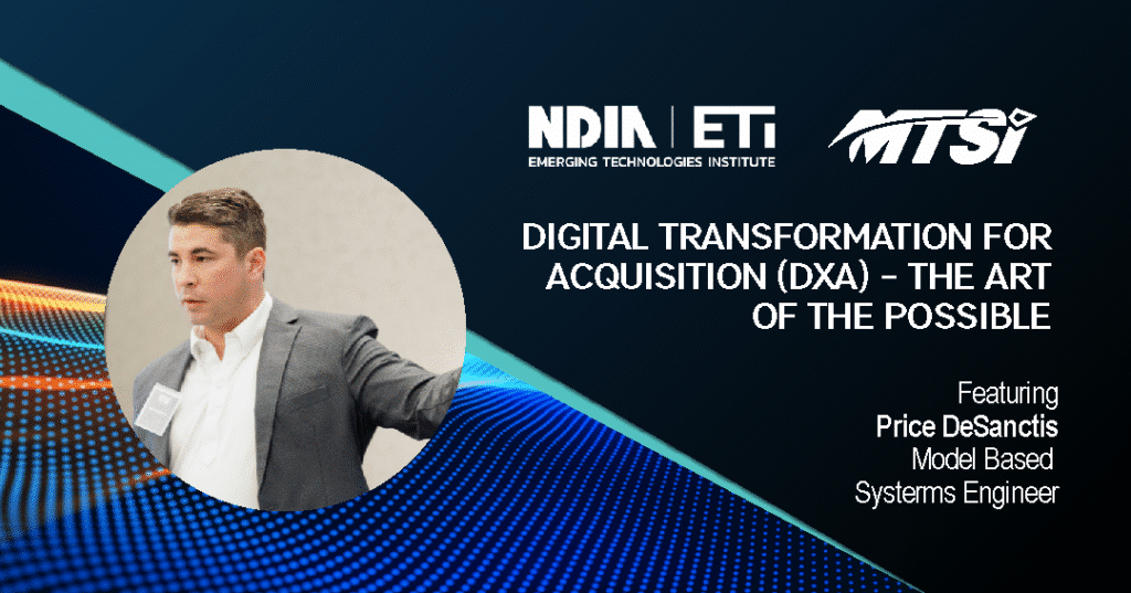 MTSI Model Based Systems Engineer, Price DeSanctis, will participate in a panel discussion during a webinar on February 25 from 1:00–2:30 PM ET. This session is part three of Emerging Technologies Institute’s (ETI) four-part webinar series, “Digital Transformation for Acquisition (DxA) – The Art of the Possible,” designed to explore how digital engineering is driving smarter acquisition and mission-level impact.